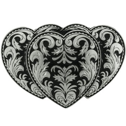 Western Triple Heart Belt Buckle is finely detailed with floral and fancy scrolls design. Heavy-duty pewter and black inlay enamel. 2.25" x 3.25"